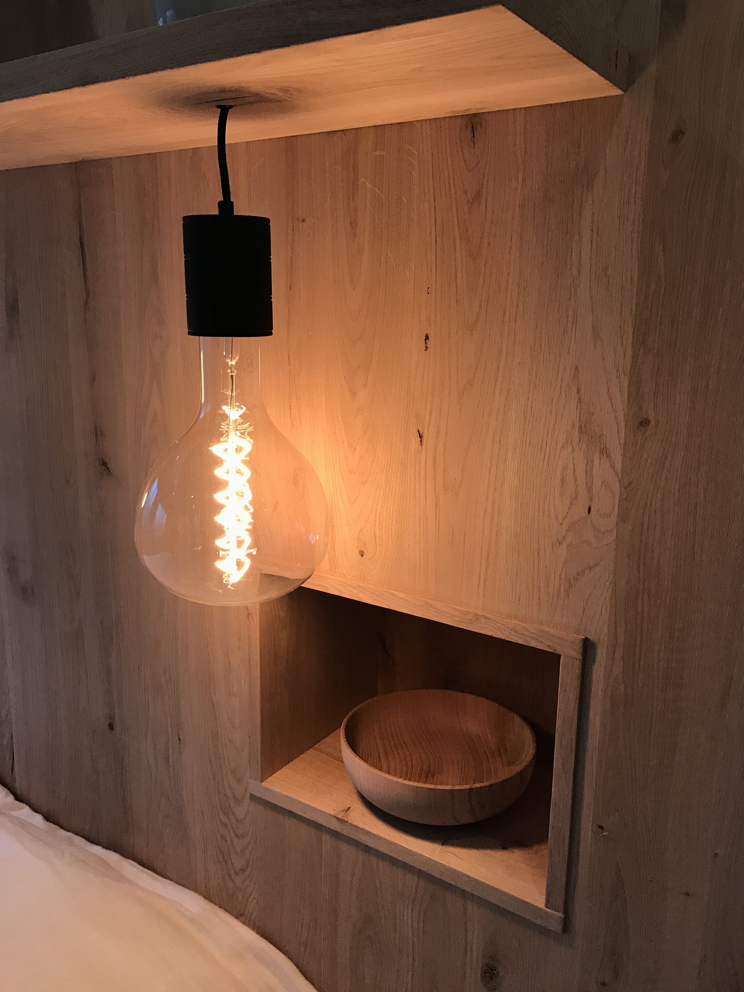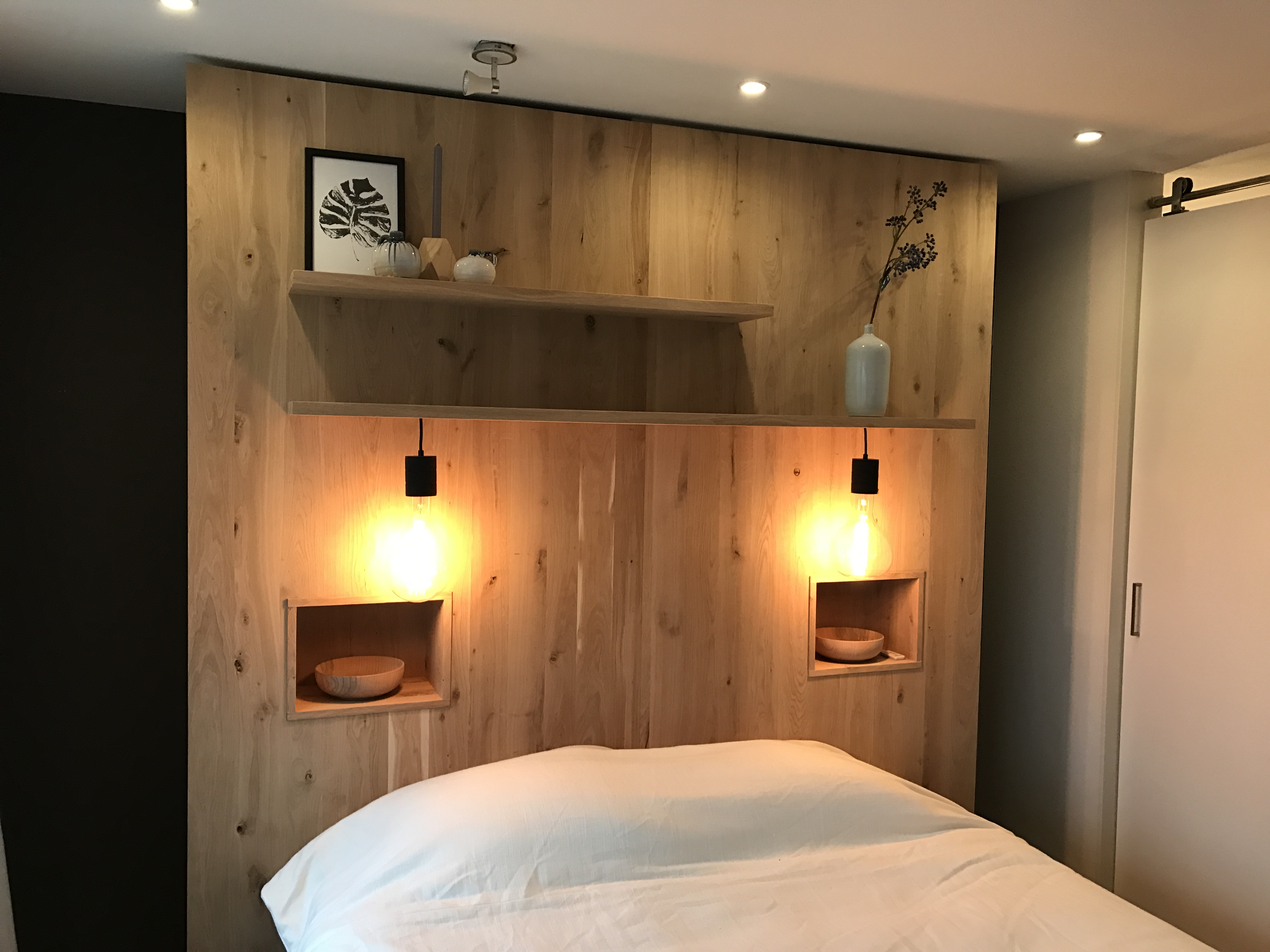 Wandbord / kast achter een bed – WortelWoods